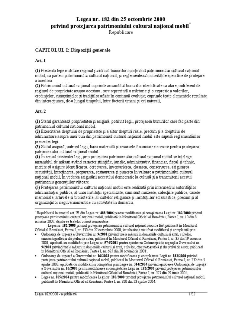182 din 25 octombrie 2000 privind protejarea patrimoniului cultural national mobil ). 182/2000 privind protejarea patrimoniului cultural national mobil. 182 din 19.12.2019 privind calitatea apei potabile.