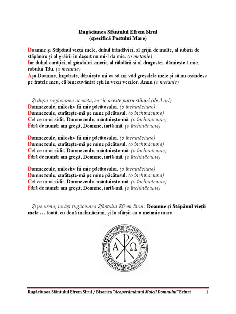 „doamne şi stăpânul vieţii mele! Dintre toate cântările şi rugăciunile din timpul postului, o singură scurtă rugăciune poate fi considerată rugăciunea specifică a acestuia. Alta rugaciune a sfantului efrem sirul.